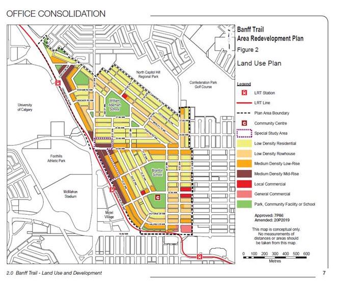 In Brentwood, most properties have R-C1 zoning, not R-C2 or R-CG. Secondly, the Banff Trail ART includes amendments that specifically allow for changes on the corner lots to permit low-density rowhouses: Brentwood, and surrounding communities such as Triwood or Dalhousie, do not. (Brentwood has a Station ARP which applies specifically to the area around the LRT Station, such as the Co-op and the malls towards Charleswood Drive.)